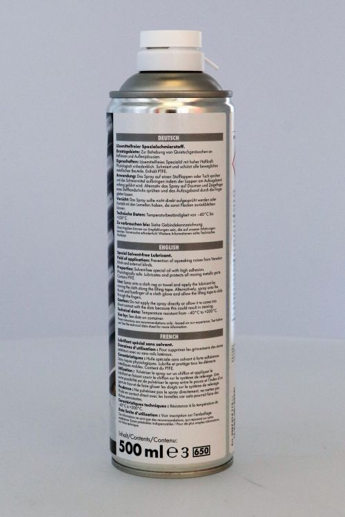Das WAREMA Aufzugsbandspray dient zur effektiven Behebung quitschender und störender Geräusche bei Raffstoren und Außenjalousien.