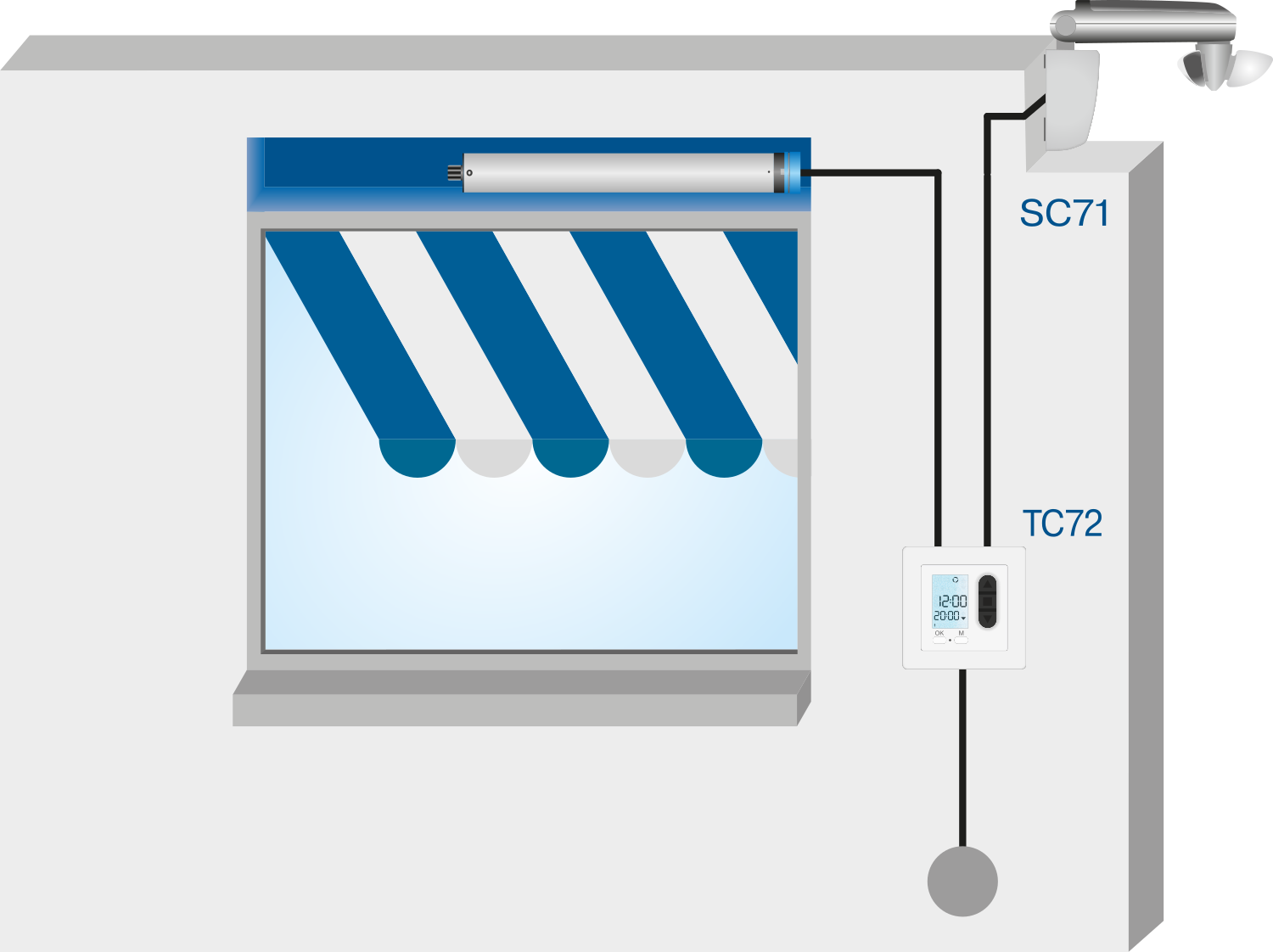 Drahtbrucherkennung in Verbindung mit der angeschlossenen Sonnen-Wind-Steuerung. Der SC71 kann durch das verstellbare Gelenk an viele Montagesituationen angepasst werden.