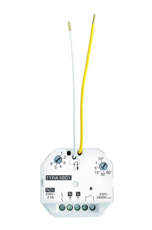 Der Funk-Empfänger Unterputz TYXIA 4801 ist ideal für die Ein-/Aus-Steuerung einer Beleuchtung oder Zeitverzögerung eines Beleuchtungskreises über einen oder mehrere bewegliche oder festinstallierte Funksender.Er hat einen potenzialfreien Ausgang und kann Beleuchtungssysteme, Abluftventilatoren und Ventilatoren bis 10 Ampere steuern.Durch die integrierte Zeitschaltuhr lassen sich die Einstellungen der Betriebszeiten der Beleuchtung variabel von 10 Sekunden bis zu einer Stunde steuern. Der Funk-Empfänger verfügt auch über eine vorausgehende Abschaltwarnung der Beleuchtung, in dem zwei aufeinander folgende Blinksequenzen der Beleuchtung den Nutzer über die Abschaltung informieren.