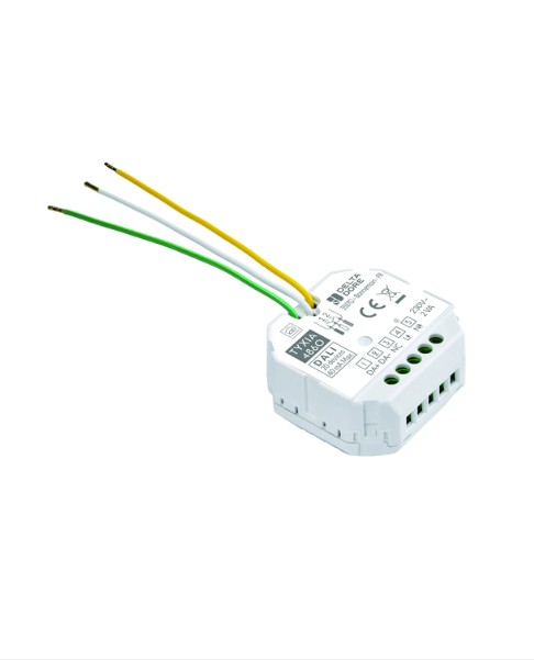 Der Funk-Empfänger TYXIA 4860 ist ein Funk-Unterputzmodul zur Steuerung von dimmbarer DALI-Beleuchtung.Steuern Sie bis zu 20 DALI-dimmbare Leuchten über einen oder mehrere Funksender oder lokal mit einem Einzeltaster oder einem Doppeltaster (+/-).Durch kurzes Drücken auf den Drucktaster führt der Funk-Empfänger TYXIA 4860 die letzte Helligkeitsstufe nach dem Ausschalten der Beleuchtung aus (Deaktivierbar).Er ist mit allen DALI-Vorschaltgeräten kombinierbar und mit der Delta Dore Smart-Home-Schnittstelleüber ein Smartphone, einen Tablet-PC oder einen Sprachassistenten (nur mit Google Home kompatibel, das in eine Routine integriert ist) steuerbar.Die Nutzungsvorteile des Produktes TYXIA 4860: