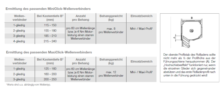| 1-gliedrig | 125 - 160 | pro 60 cm Wellenlänge bzw. je 6Nm Motorleistung einen starren Wellenverbinder | max. 12 pro Wellenverbinder | Mini-/Maxi-Profil¹ |
