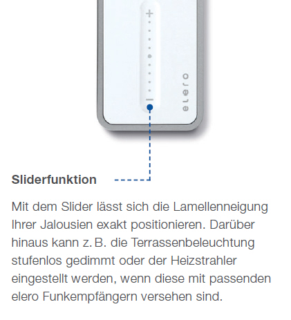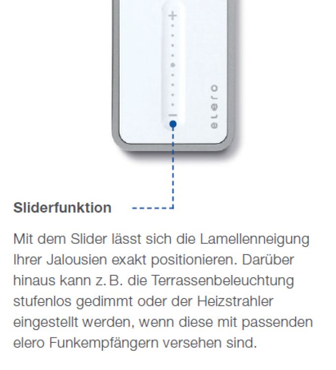 Durch die Sliderfunktion lässt sich die Lamellenneigung Ihrer Jalousie exakt positionieren, die Terrassenbeleuchtung stufenlos dimmen oder der Heizstrahler einstellen, wenn diese mit einem passenden elero Funkempfänger versehen sind.► In Verbindung mit dem elero JA Comfort Jalousieantrieb