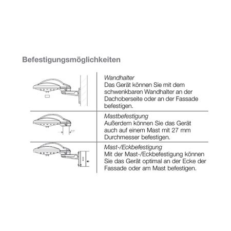 ► Der Sensero-868 AC lässt sich mit Hilfe eines schwenkbaren Wandhalters leicht an der Fassade oder Dachoberseite anbringen. Außerdem ist eine Befestigung an einem separaten Mast möglich.