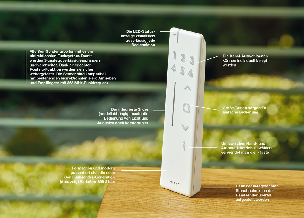 Entdecken Sie die Vielseitigkeit des VarioSon-868 Slide : Der Premium Funkhandsender von elero
