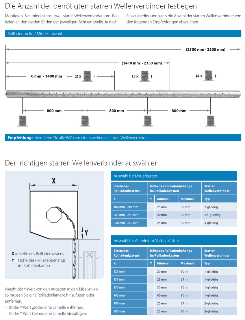 Die innovativen Rollladenbefestigungslösungen bieten eine schnelle und einfache Montage für Rollladen mit Achtkantstahlwellen SW40, SW50 oder SW60. Durch das Hochdrücken des Rollladenbehangs wird Einbruchschutz gewährleistet. Die Verbindung zum Rollladenbehang erfolgt mithilfe eines Aufnahmeprofils, das für 8mm bzw. 14mm Rollladenstäbe geeignet ist. Jeder Wellenverbinder ist für ein maximales Rollladengewicht von 7kg ausgelegt. Für den RolloTube C-line empfehlen wir die Verwendung von starren Wellenverbindern, um das Selbstlernen der Endpunkte zu ermöglichen.