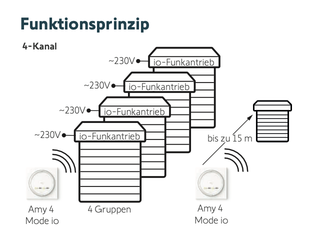 Der Amy 1 io 4-Kanal Funksender in modernem Design zur Ansteuerung von io-Antrieben bzw. io-Empfängern, wie z. B. Rollläden, Außenjalousien oder dimmbares Licht. Es können bis zu vier Produkte bzw. Produktgruppen bedient werden.