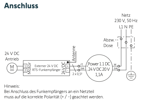 Bitte beachten: Spannungsversorgung nur mit geregelten Netzteilen. Bei Anschluss des Funkempfängers an ein Netzteil muss auf die korrekte Polarität (+ / -) geachtet werden.