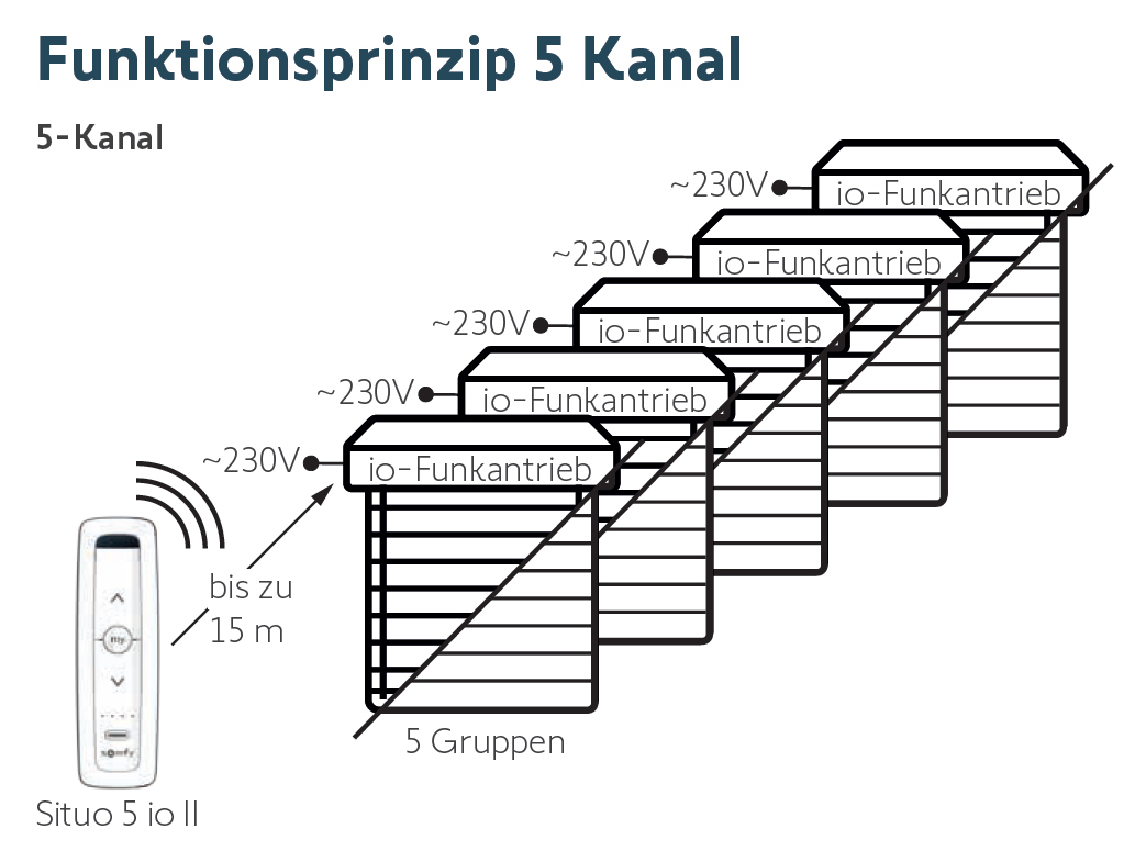 Der Situo 5 io von Somfy ist ein 5-Kanal Funkhandsender zur Ansteuerungeinzelne bzw. einer Gruppe von io-Motoren bzw. Empfängern mit bidirektionaler io-Funktechnologie. Der in elegantem Design und in 4 Farben erhätlichem Handsender dient zur komfortablen Bedienung von Rollladen, unterschiedlichen Markisen, Klappladen, Beleuchtung, Heizwärmestrahler etc.. Dank der bidirektionalen Funktechnologie erhalten Sie an Ihrem Handsender eine Rückmeldung ob der Befehlt ordnungsgemäß ausgeführt wurde. Neben dem Situo 5 io ist sowohl der Situo 1 io, als Einkanal-Handsender als auch die Smoove io Reihe als Funkwandsender erhältlich.