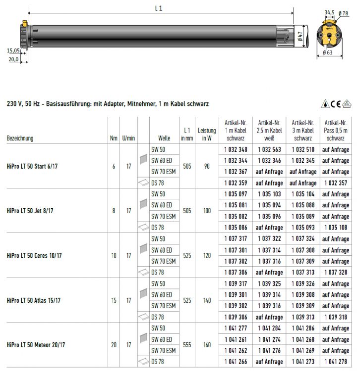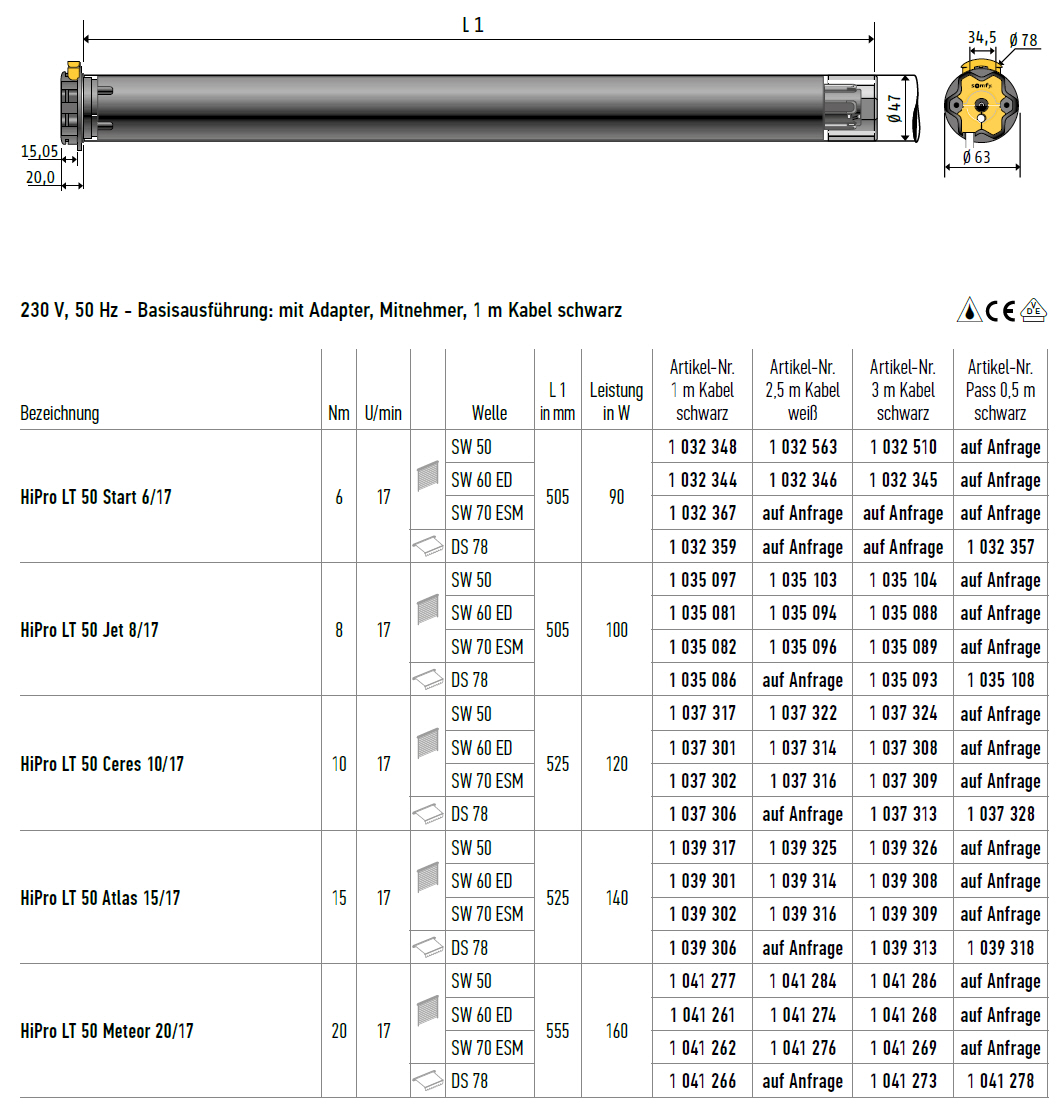 Somfy HiPro LT 50 Start 6/17 Rollladenmotor SW60 ED #1032344 #1032345 #1032346