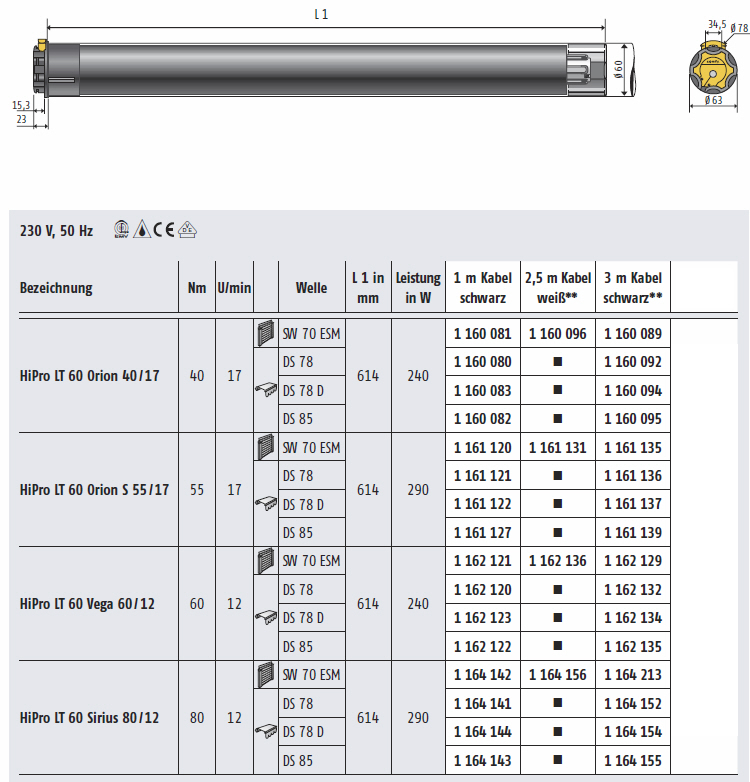 Der Markisenmotor HiPro LT 60 ist der Klassiker zur Motorisierung von Markisen mit mechanischer Endlageneinstellung über Einstelltasten. Ein Einsteckantrieb mit mechanischer Vorrichtung zur Fixierung der Endlagen. Ein Tastendruck am Markisenmotor genügt und schon ist die obere und untere Endlage eingestellt.Produktmerkmale