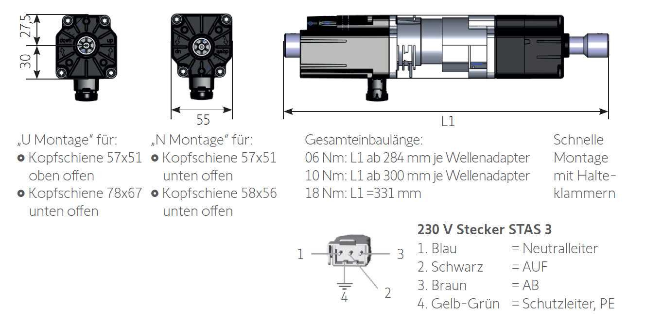 - Permanente Drehmomentüberwachung: Festfrierschutz und Hinderniserkennung in Auf-Richtung mit einzigartigem Backrelease zur Entlastung der Aufzugsbänder