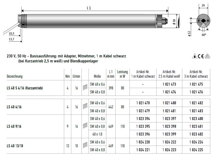 Somfy LS 40 Mars 9/14 Rohrmotor 40 x 1,0 #1023053 #1023056 #1023059
