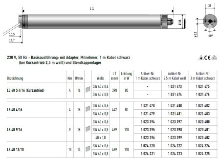 - Motor für Minirollläden und textilen Sonnenschutz LS 40 S 4/16 Kurzantrieb