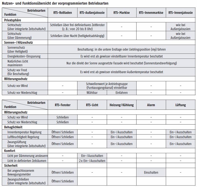 - Es können Rollläden, Markisen (innen / außen), Fenster, Jalousien (innen / außen) und Licht per sicherem RTS-Funk angesteuert und automatisiert werden