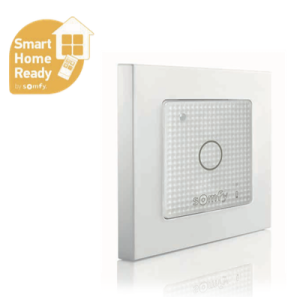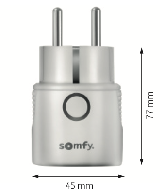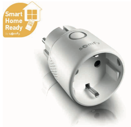 Der Somfy On/Off Zwischenstecker zum Einbinden von Leuchten und kleineren elektrischen Geräten per io-Funk in manuelle, Kalender- und Wenn-Dann-Szenarien aller Smart-Home-Zentralen von Somfy (d. h. sowohl aktuelle als auch nicht mehr verkaufte Zentralen).