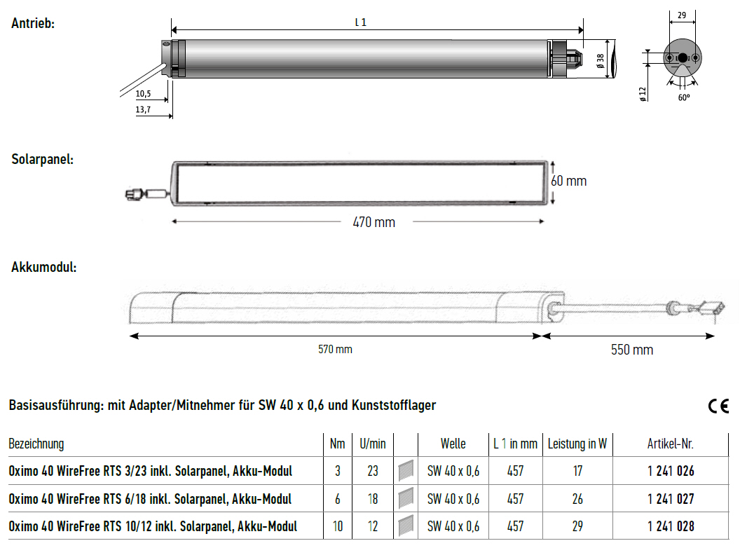 Somfy Oximo 40 WireFree RTS II 3/23 Solareinsteckantrieb Welle SW 40 x 0,6