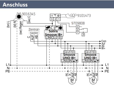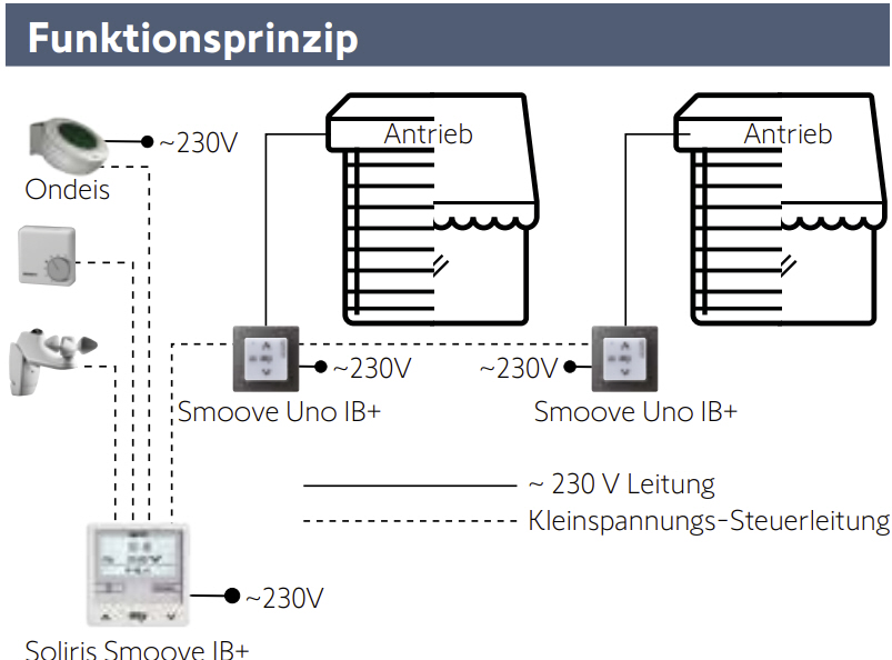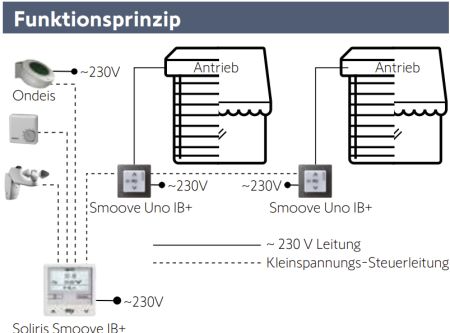 Zentralsteuergerät zur zeit-, wind- und helligkeitsabhängigen sowie zur manuellen Steuerung verdrahteter Antriebe. Je Antrieb wird zusätzlich ein Smoove Uno IB+ Motoreinzelsteuergerät benötigt – per IB-Bus mit Soliris Smoove IB+ verbunden. Messung der Windgeschwindigkeit und Sonnenintensität über kombinierten und im Lieferumfang enthaltenen Sensor.Auch größere Anlagen mit bis zu 100 Motorsteuergeräten Smoove Uno IB+ und einer Busleitungslinie bis zu 1.000 m lassen sich steuern. Verwaltung von bis zu 3 Zonen mit unterschiedlichen Schaltzeiten über das QuickCopy Tool (Art.-Nr. 9019596, separat erhältlich). Rückwärtskompatibel mit IB Motorsteuergeräten (1 Zone).