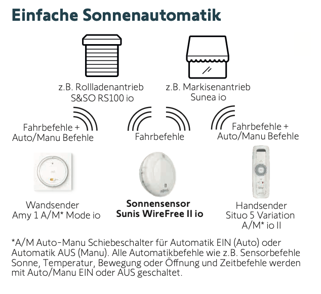 Der Sunis Wirefree II io kann ebenfalls in die TaHoma Premium oder Connexoon io eingelernt werdenund sendet Helligkeitswerte an diese bidirektionalen Steuerungen. Bei Über- oder Unterschreiten deseingestellten Schwellenwertesin der TaHoma Premium oder Connexoon io werden enstprechende Fahrbefehle (AUF/AB) an den Antrieb gesendet. Die Automatik kann in TaHoma Premium oder Connexoon zentral ein- und ausgeschaltet werden oder vor Ort mit dem Auto/Manu Schiebeschalter am Wandsender Smoove A/M io oder Handsender Situo 5 Variation A/M io.