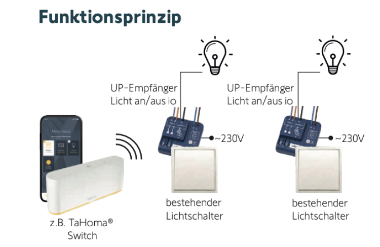 - Kleine Baugröße zum Einbau hinter bestehendem Schalter oder in eine Abzweigdose