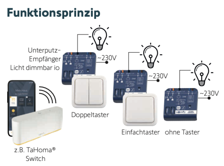 - Einbindung dimmbare Beleuchtung in Smart-Home-Funktionalitäten von TaHoma (z. B. manuelle, Kalender- und Wenn-Dann-Szenarien)