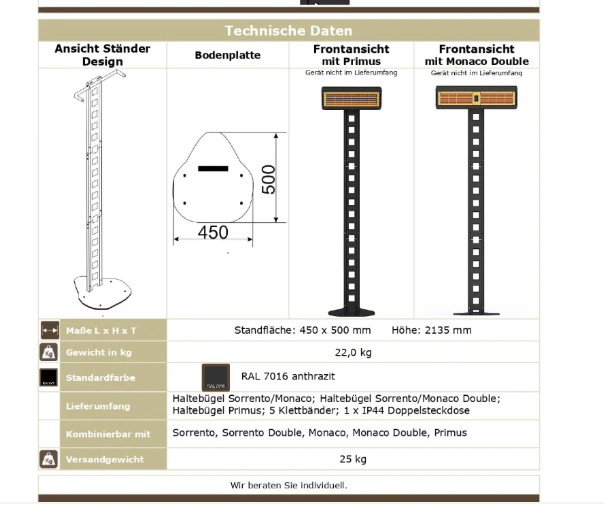| Masse Mobilständer mit Bodenplatte: | L 450 x B 500 x H 2135 mm |