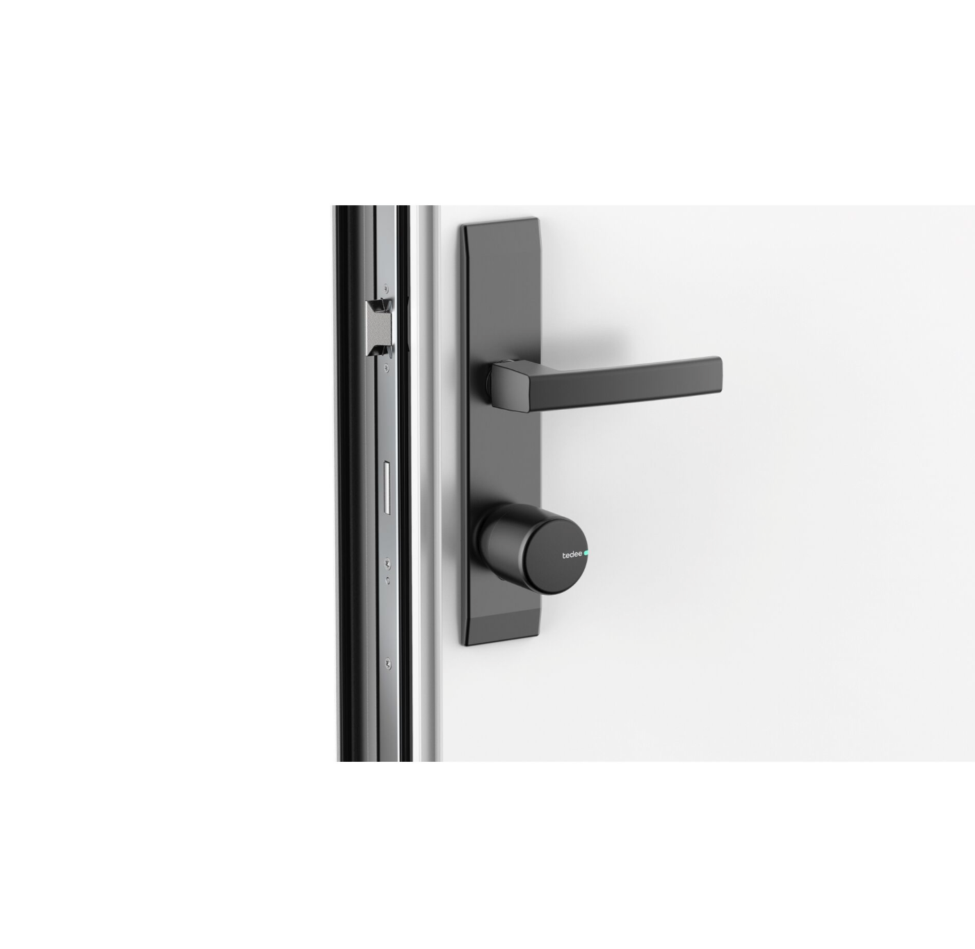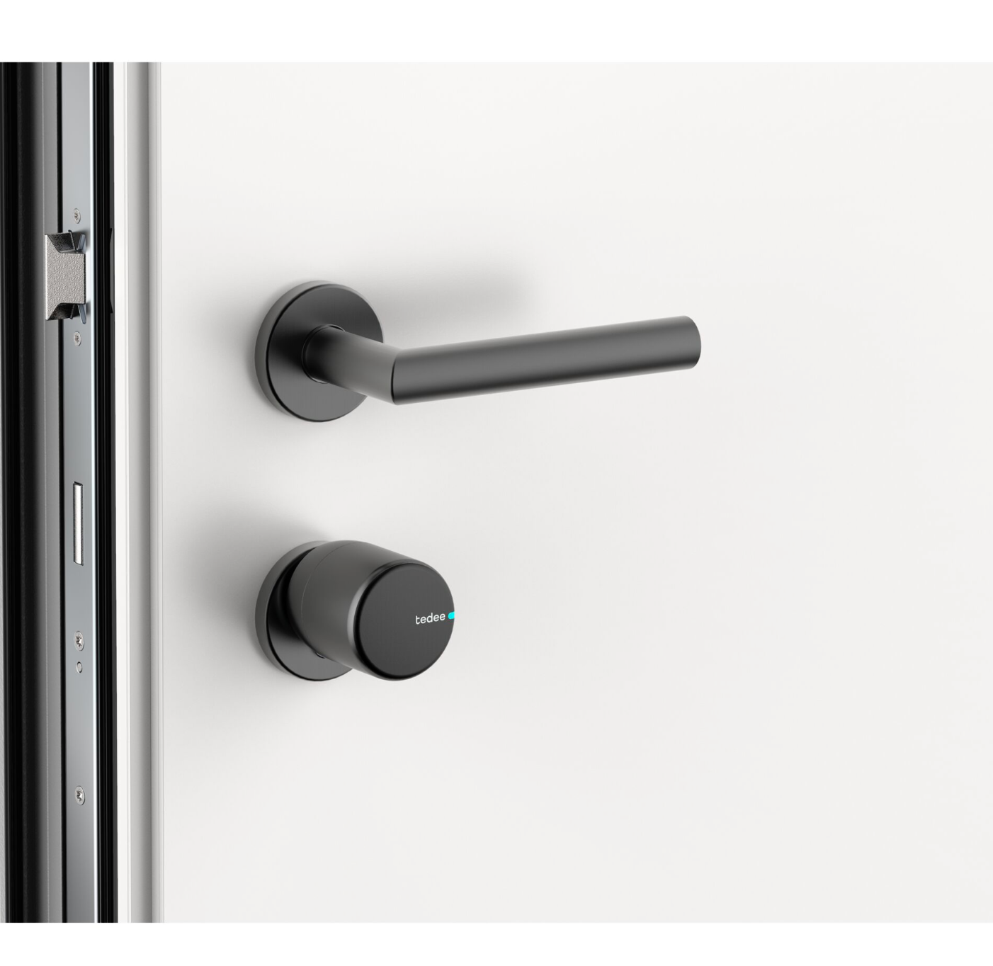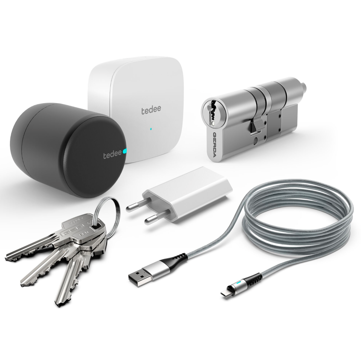 - Set bestehend aus dem smarten tedee-PRO-Türschloss, tedee-Bridge und einem längenverstellbaren Euro-Profilzylinder mit festem Außenmaß (30 mm)