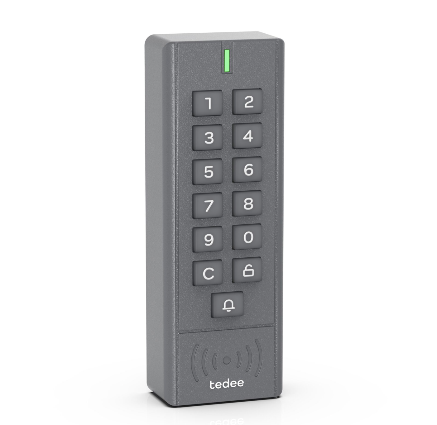 - tedee-Keypad: Das Tastenfeld mit Hintergrundbeleuchtung ermöglicht den Zugang ohne Smartphone durch die Eingabe eines fünf- bis achtstelligen Zugangscodes. Das tedee-Keypad ist gemäß der Schutzklasse IP65 staub- und wasserdicht. Bis zu 100 Codes können individuell und für bestimmte Zeiträume in der tedee-App generiert werden.