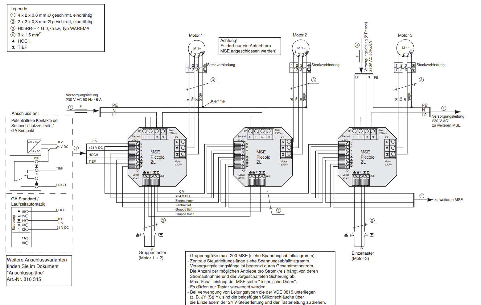 Die Motorsteuereinheit Piccolo ZL UP ist eine Motorsteuereinheit für die Unterputzmontage, die Fahrbefehle von Steuerzentralen an Sonnenschutzprodukte mit 230 V Antrieb übermittelt. Die Versorgungsspannung von 24 V DC erhält die Motorsteuereinheit über eine Steuerleitung direkt von einer Geschossansteuerung oder einem externen Netzteil. Das Logikverhalten des Schalters ist Zeitlogik. Die Zeitlogik bewirkt, dass die MSE nach einer Betätigungszeit des Tasters von ca. 2 Sekunden in Selbsthaltung geht. Eine kürzere Betätigung des Tasters erzeugt einen Wendeimpuls (bei Lamellenprodukten). Die Motorsteuereinheiten können Fassaden übergreifend über die Steuerleitung zu Gruppen zusammengefasst und mit einem Taster gemeinsam bedient werden.Die Motorsteuereinheit und die Zentrale werden über eine Steuerleitung verbunden. Die Steuerspannung von 24 V ermöglicht Ihnen die Verwendung einer Schwachstromleitung (J-Y(St)Y).Produktmerkmale