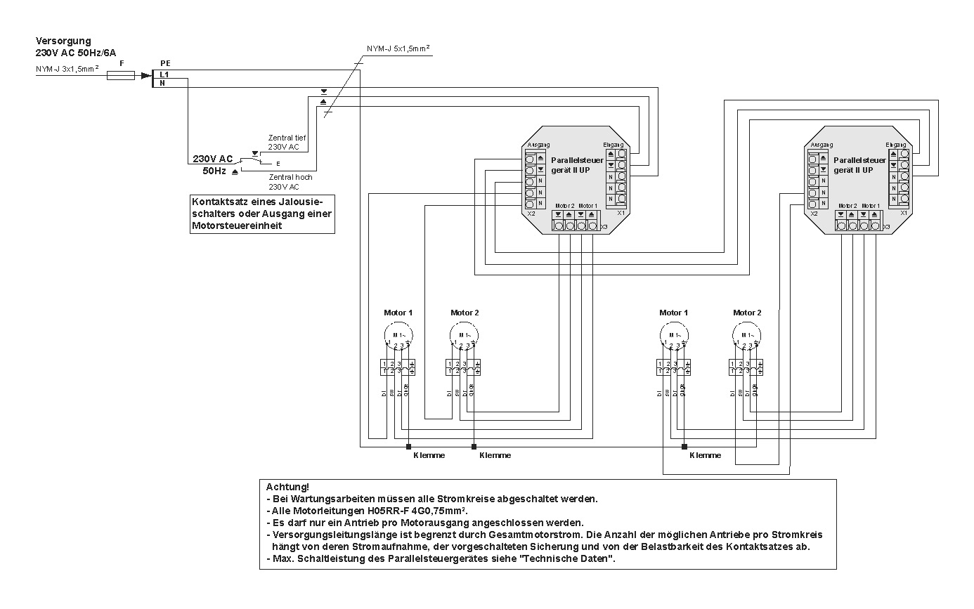 - Steuerung mehrerer 230 V-Antriebe über einen Schalter oder eine Steuerzentrale