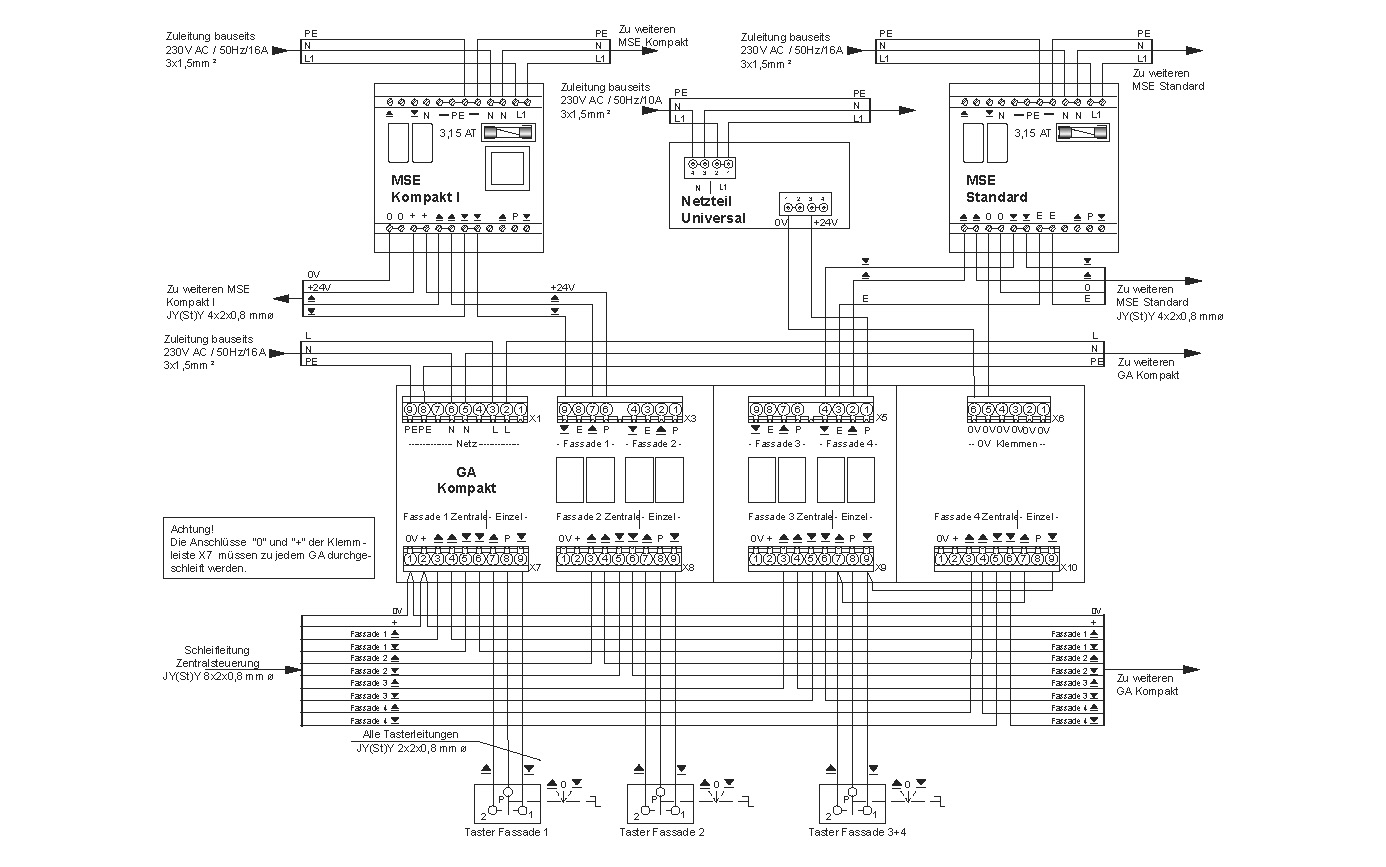 - 4 Eingänge für lokale Jalousietaster zur Fassadensteuerung
