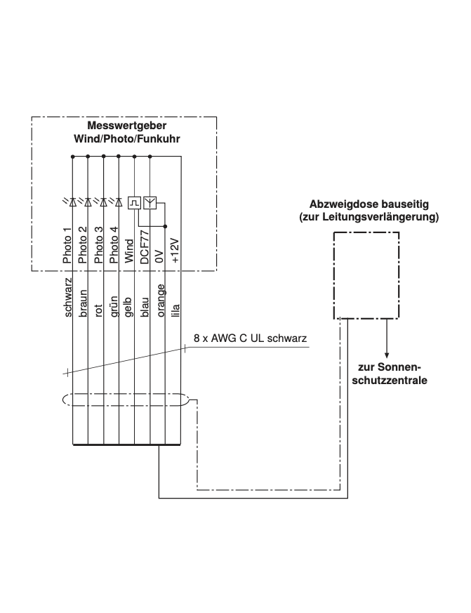 - witterungsbeständige (für den Außeneinsatz geeignete) Leitung z.B. 6 x AWG 26 C UL (UV-beständig) erforderlich