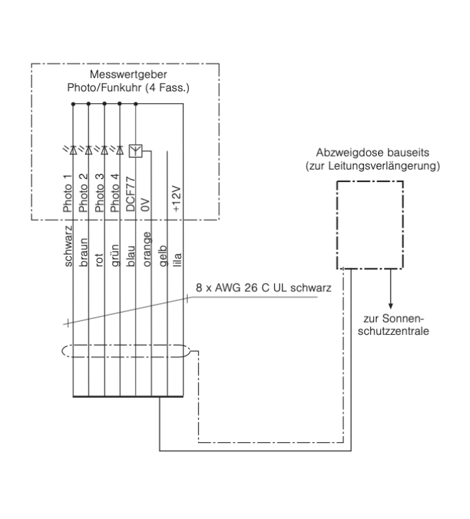 - witterungsbeständige (für den Außeneinsatz geeignete) Leitung z.B. 8 x AWG 26 C UL (UV-beständig) erforderlich