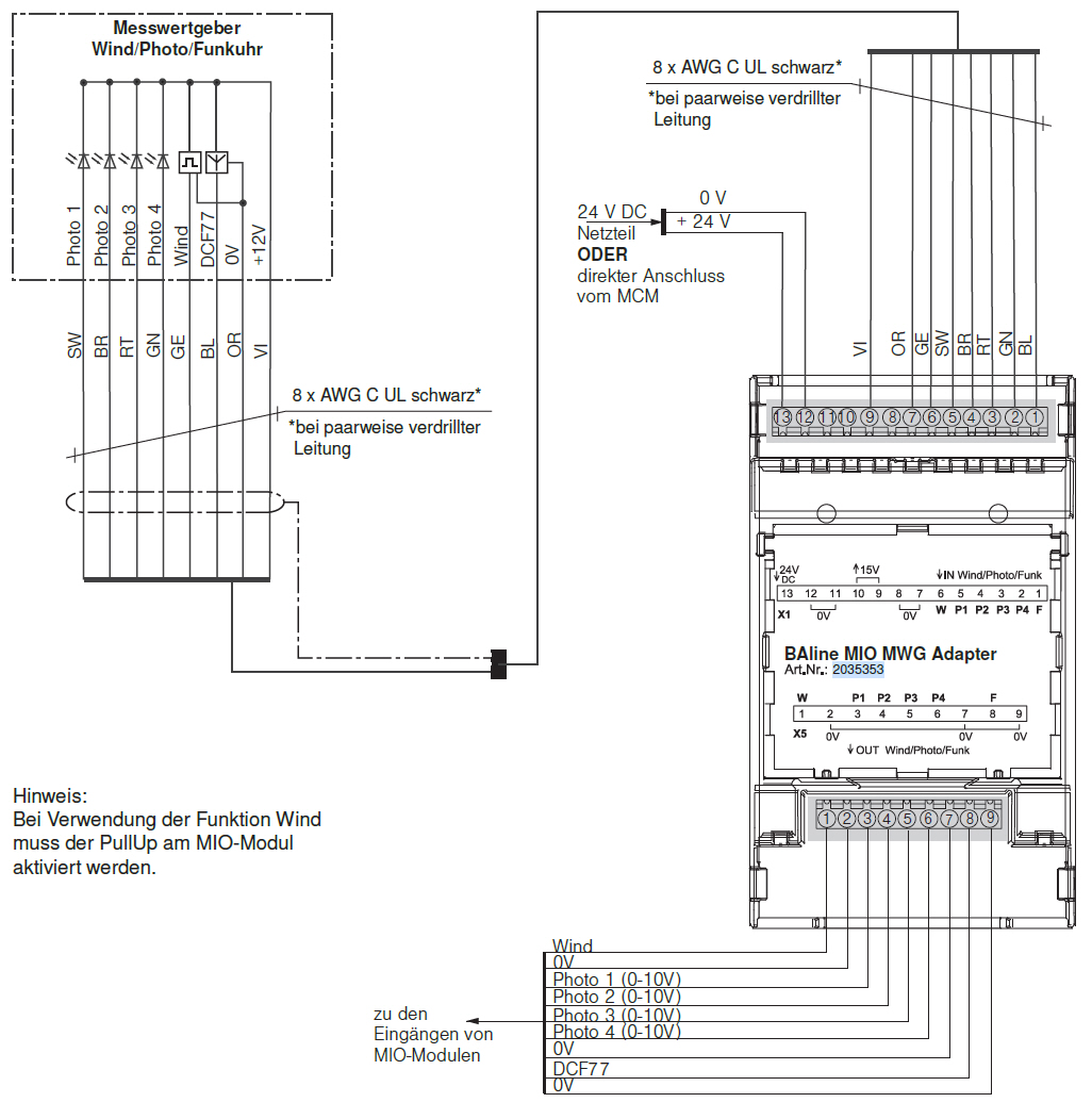 Passive Sensoren wie Wind/Photo oder Funkuhr-Messwertgeber liefern ursprünglich sehr einfache elektrische Signale, die nicht direkt von vielen Standard-Eingängen ausgewertet werden können. Der MIO MWG Adapter übernimmt diese Umformung, sodass die Signale direkt an einen Universaleingang eines BAline MIO-Moduls angeschlossen werden können – ohne externe Verdrahtung oder zusätzliche Beschaltungen. WAREMA
