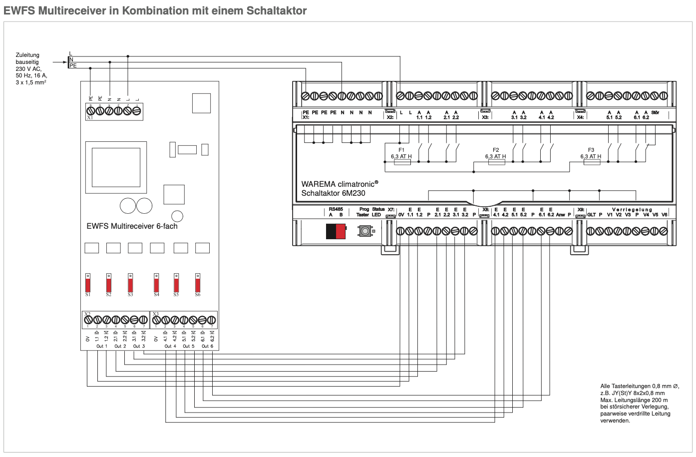 Der 6-fach EWFS Empfänger ist ein elektronisches Steuergerät zur direkten Ansteuerung der Tastereingängen von WAREMA Aktoren und Motorsteuereinheiten (MSE). Er kann HOCH- und AB-Fahrbefehle von EWFS kompatiblen Sendern empfangen und weiterleiten. Der EWFS Multireceiver arbeitet im Totmannbetrieb - das Fahrverhalten des angeschlossenen Aktors oder Motorsteuereinheit bleibt hierbei erhalten. Der EWFS Multireceiver beinhaltet 6 Empfänger - dies bietet die Möglichkeit bis zu 12 Tastereingängen getrennt anzusteuern.Produktmerkmale