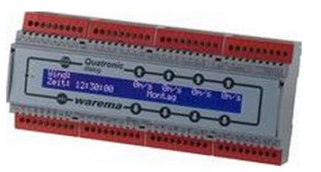 Die WAREMA Quatronic dialog steuert an kleineren und mittleren Objekten Sonnenschutzprodukte in Abhängigkeit von mehreren Faktoren, z.B. Wind- und Sonnenintensität. Ein Klartextmenü informiert z.B. über die Uhrzeit, die Windgeschwindigkeit und Sonnenintensität sowie über die Ausführung eines Steuerbefehls.