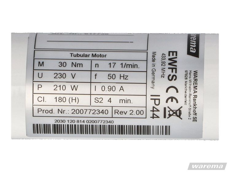 Der WAREMA EWFS Funkmotor basiert auf dem WAREMA unidirektionalen EWFS Funksystem mit einer Sendefrequenz von 433,92 MHz. Der Rohrmotor ist für 230 V/50 Hz ausgelegt und verfügt über eine automatische Endabschaltung auf Drehmoment mit integriertem Funkempfänger. Die Einstellung der Endlagen wird mittels Handsender vorgenommen.
