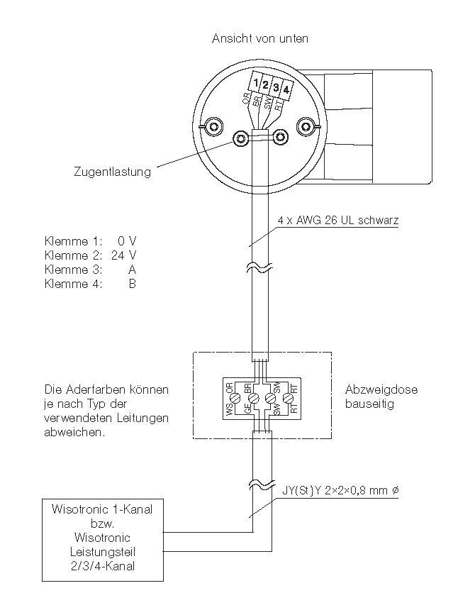 - Spannungsversorgung mit 24 V DC erfolgt über vieradrige Busleitung über das Wisotronic Leistungsteil