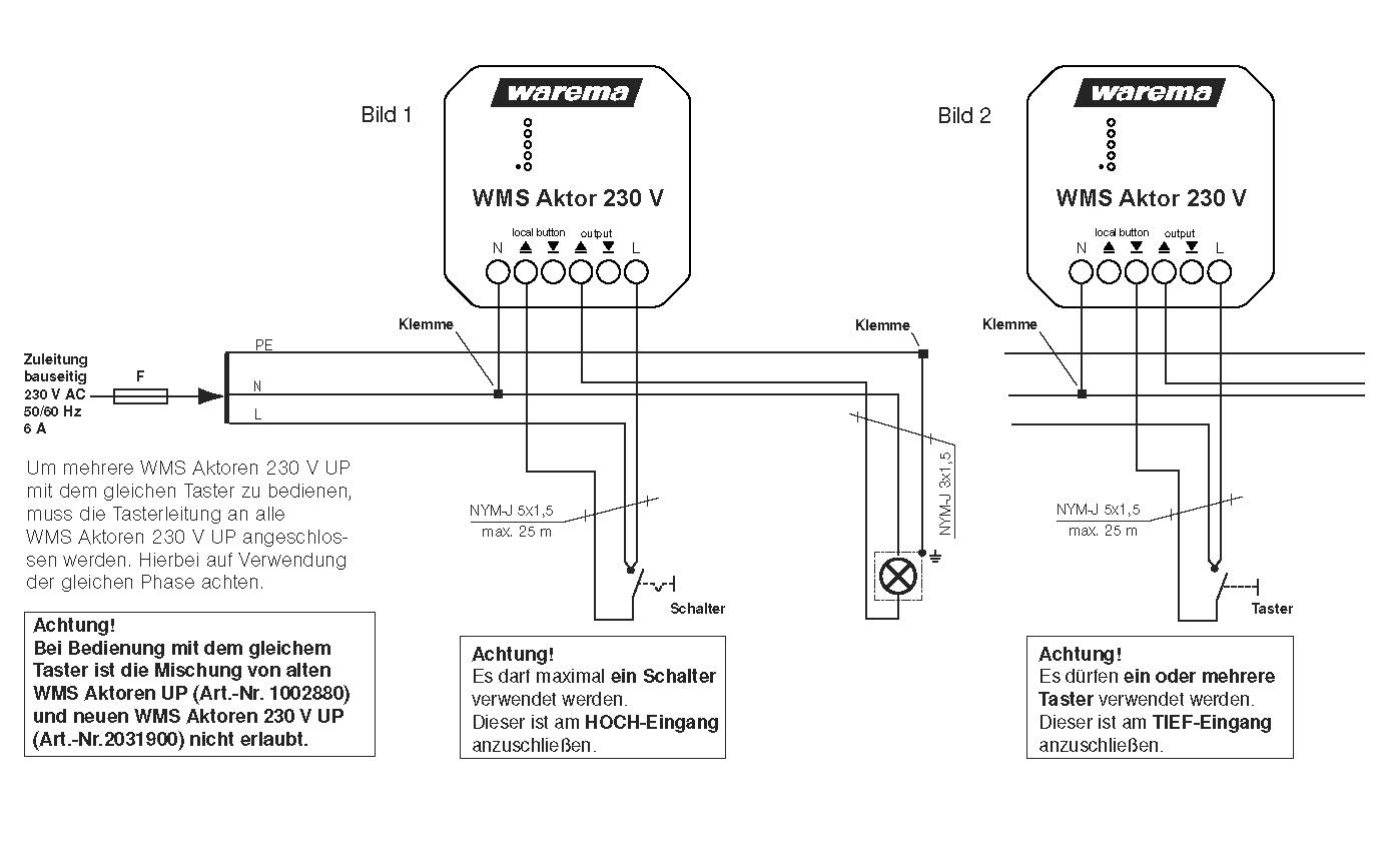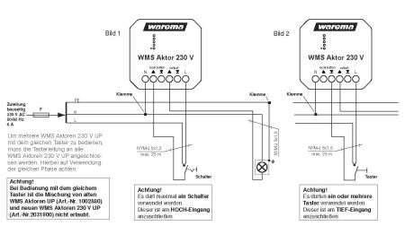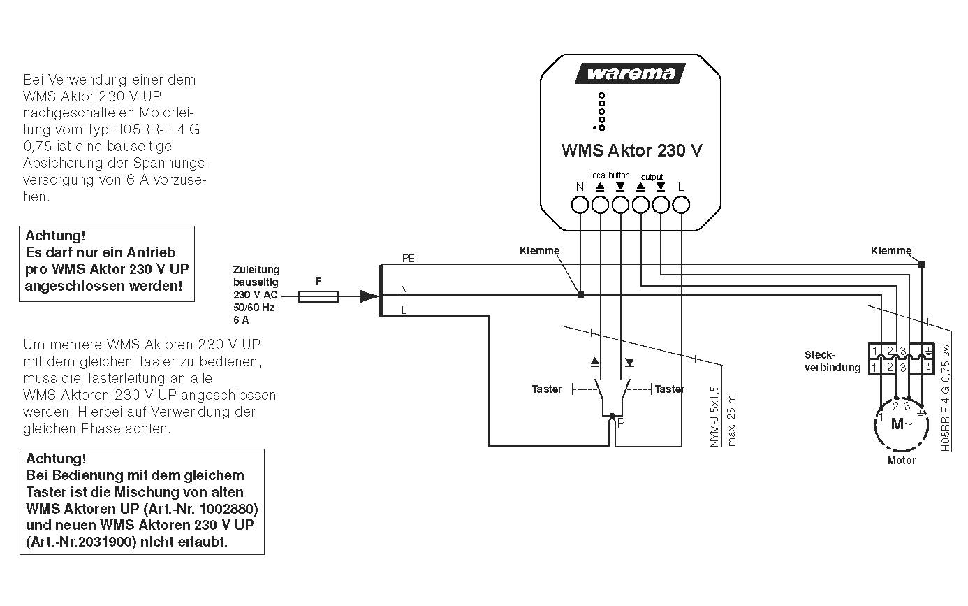 ► Nachfolger des WAREMA WMS Aktor #1002880Der WMS Aktor für 230V Sonnenschutzprodukte, Beleuchtung (z.B. Glühbirne) und Fensterantriebe ist für die Installation in einer handelsüblichen Unterputzdose vorgesehen. Der Aktor kann Fahrbefehle von WMS Sendern (Hand- oder Wandsendern, WMS Zentrale oder WMS Wetterstationen) empfangen und zeigt diese als Rückmeldung an den Sendern an. Parameter für die Automatikfunktion sowie Positionszenen für die Komfort- oder Szenensteuerung werden direkt im Aktor gespeichert und können jederzeit abgerufen werden.